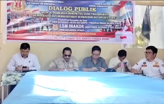 Ketua LSM INAKOR DPW Sulawesi Utara, Rolly Wenas, menyampaikan bahwa kegiatan dialog publik ini merupakan bagian dari upaya masyarakat sipil dalam memberikan edukasi politik kepada masyarakat sekaligus membuka ruang diskusi terkait pelaksanaan Pemilihan Hukum Tua di sejumlah kabupaten di Sulawesi Utara.