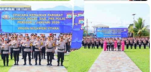 MANADO, visualharian com Humas Polda Sulut – Kapolda Sulawesi Utara Irjen Pol Roycke Harry Langie memimpin Upacara Laporan Kenaikan Pangkat (Korps Raport) anggota Polri periode 1 Januari 2026 dan PNS Polri, di Lapangan Presisi Mapolda Sulut, Rabu (31/12/2025).
