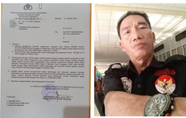 Surat yang ditandatangani oleh Kasat Reskrim Polresta Manado, Kompol Muhammad Israil, S.I.K., M.H., itu menjelaskan bahwa kepolisian telah melakukan penelitian terhadap materi laporan yang diajukan LSM KIBAR pada 29 September 2025.